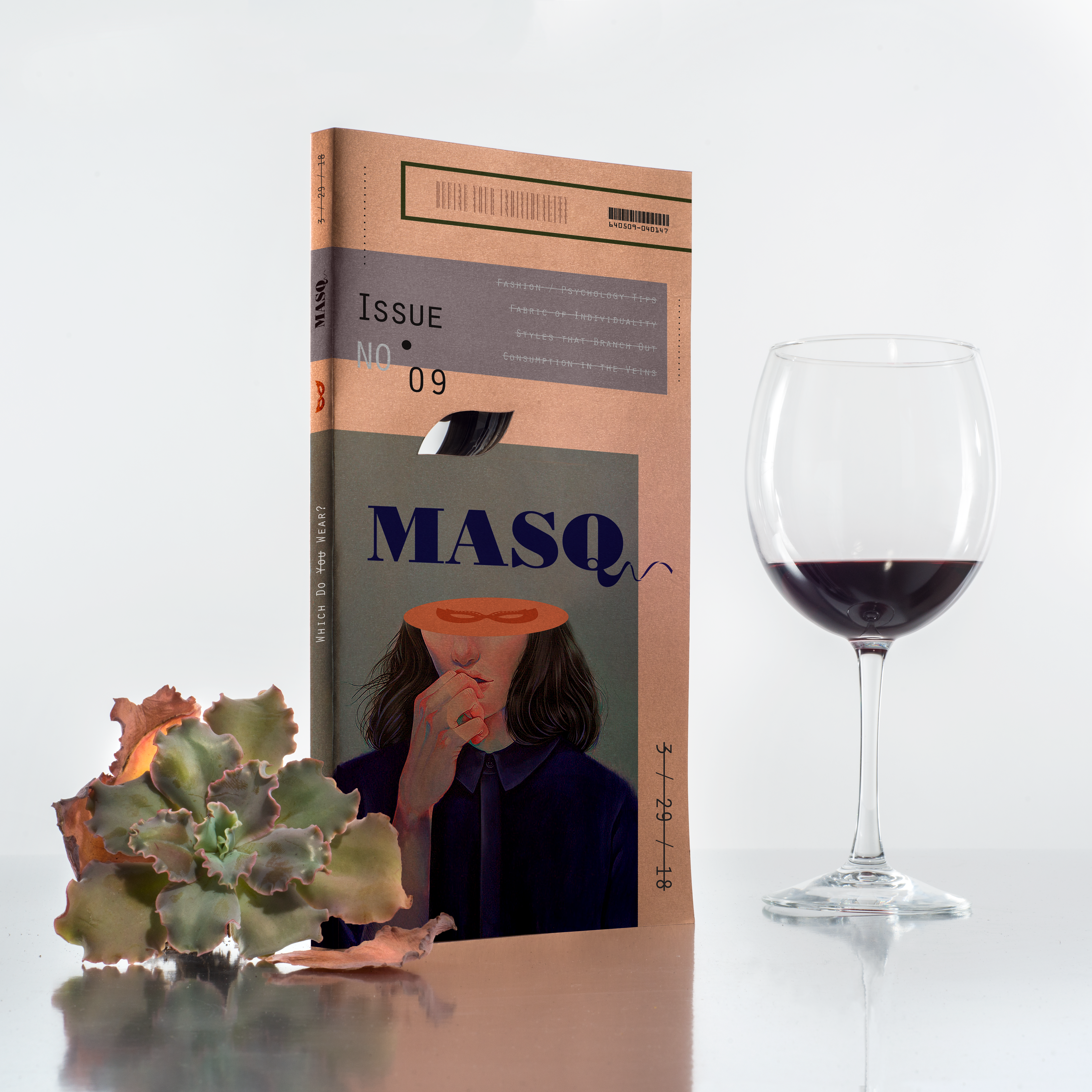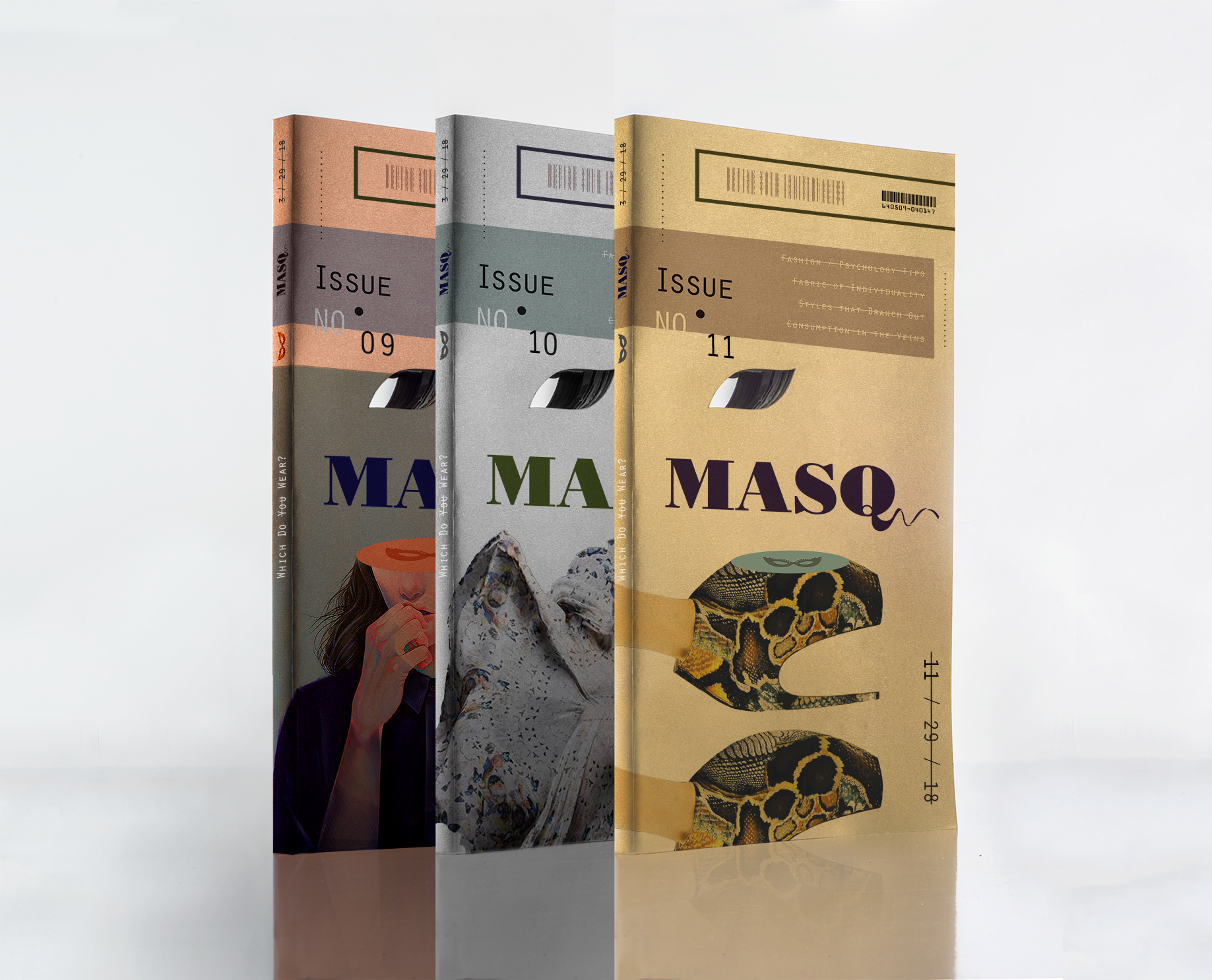 Masq is an annual fashion magazine that recognizes the hypocrisy within the fashion industry.This masq-gazine is laser cut through the center in the shape of a cat-eye so that when the reader opens the magazine, they see that they too wear the mask.